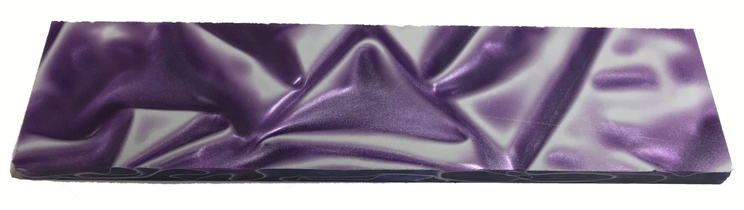 The Blue Purple Swirl knife scales are a two-color scale. Both sides are a blueish purple, but one side is bluer, and the other side is purpler (if that wasn’t a word, it is now). The two colors are separated by a swirling white ribbon. Sand down just a little bit and you’ll be able to see both colors on each side. The colors go well together giving this blank a subtler feel.