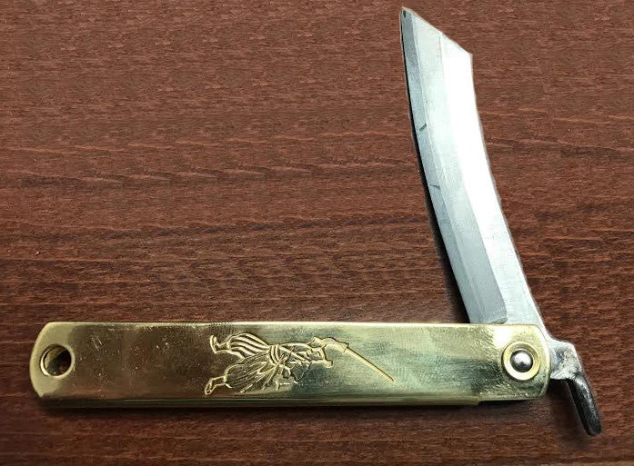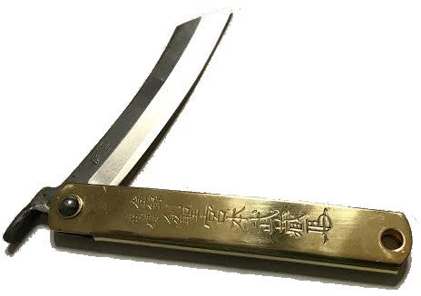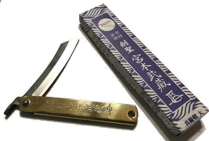 This small, spring-less folding knife is a pleasure to use and to hold. It has a very solid 3″ long, 1/8″ thick blade in a handsome, solid brass case. The blade is laminated high carbon steel – it will take and hold a good sharp edge. Use it for marking out and trimming, or anywhere you would use a tough knife. It’s equally at home in the workshop or on the desktop – it sharpens pencils to perfection. Only 4 3/4″ long folded.