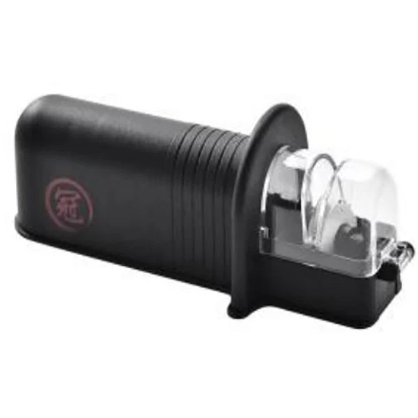 Dimensions: 6″ x 2.5″ x 2.5 (L x W (at widest) x Hieght). Non-slip base. Preset sharpening angle for all knives with double-beveled edge.Â