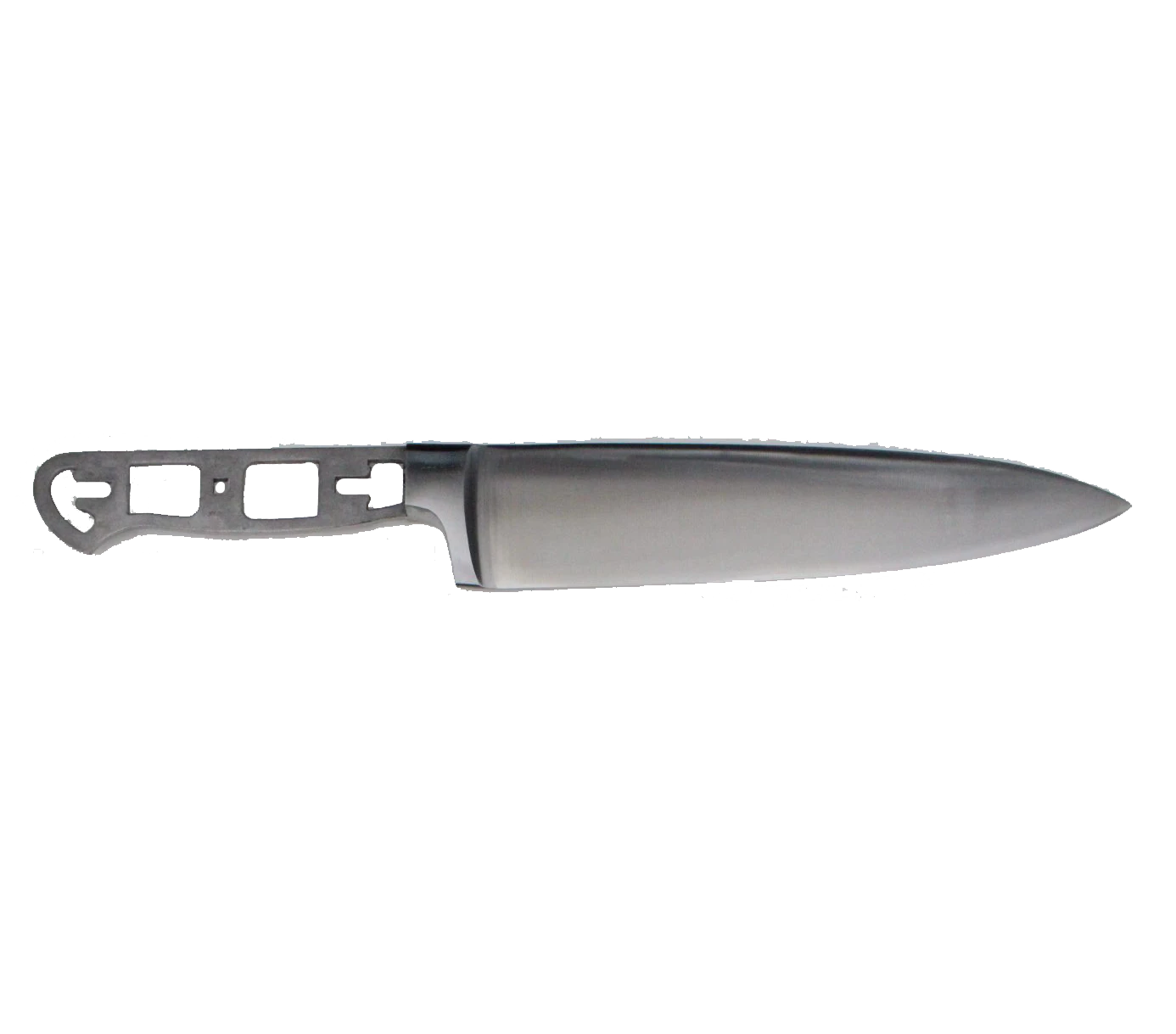 This Stainless Steel Chef Knife will be a great addition to any kitchen. This blank has a great looking bolster and it is perfect for all your chopping and slicing needs. It comes pre sharpened and heat treated thus making it perfect for the kitchen, BBQ or campsite. This knife will be a great addition to your arsenal, to build and it will bring a smile to the users and wanting looks from any onlookers. This is a great canvas for your customization.
