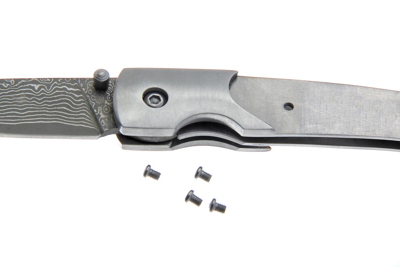 The frame is stainless, satin finish, and the blade is San Mai Damascus steel, no two patterns the same, each unique “snow flake” individuals.