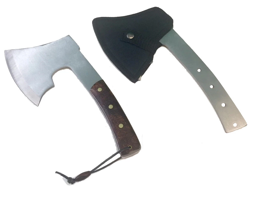 Camping, hiking, throwing and survival; this is the perfect and handy size ax. Extremely tough and stainless. Designed to be ergonomically utilitarian this sharped blade comes with belt looped nylon sheath. Perfect weight to power exchange it’s size is effective without being burdensome. Comes as blank ready for custom handling or para-cord finish. Finished Ax is for example only not for sale.