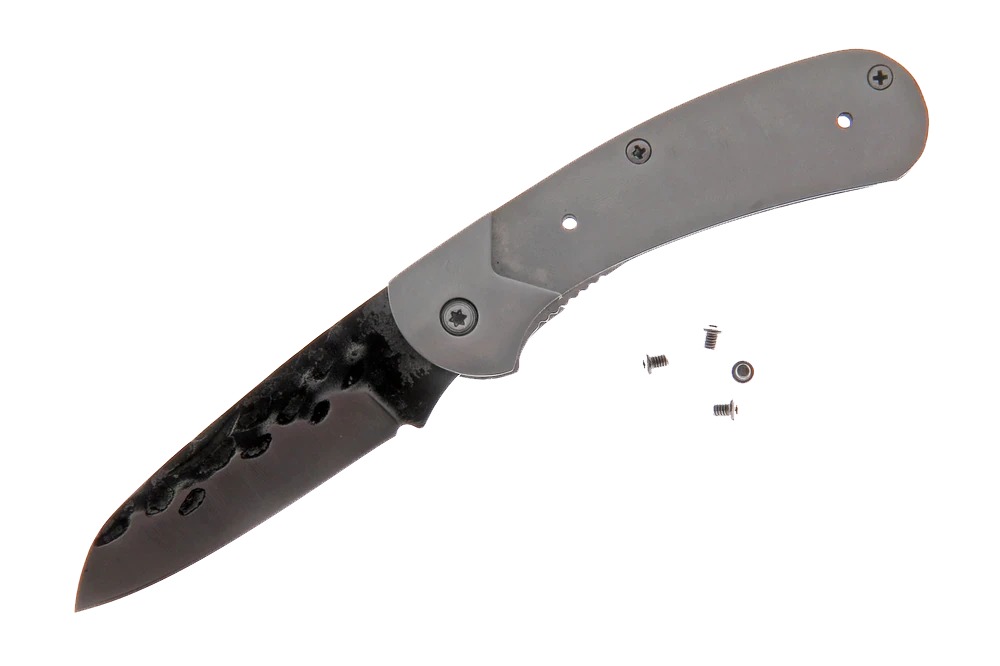 This tough little folder sports an unusual shaped utilitarian blade. The knife just feels right in your hand. The blade has a hammered finish and is made of high quality 7cr17MoV stainless steel with an RC rating of 57-58. Features a polished bolster and heavy steel frame, it comes sharpened and ready to use, just add your handle preference.