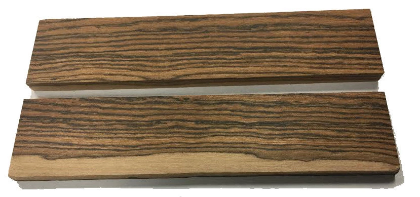 Bocote is an exotic wood native to Mexico, Central America, and the West Indies. It features a wide range of grain patterns from straight to wild, with curved lines and swirls. The color ranges from golden brown to tan to golden yellow. It is a hard, heavy, and dense wood, strong and stiff, with a medium texture. Mainly used for custom pool cues, cabinetry, veneer, furniture, inlays, knife handles, and pens. It polishes well with wax or polyurethane, and will take a moderately high natural gloss.
