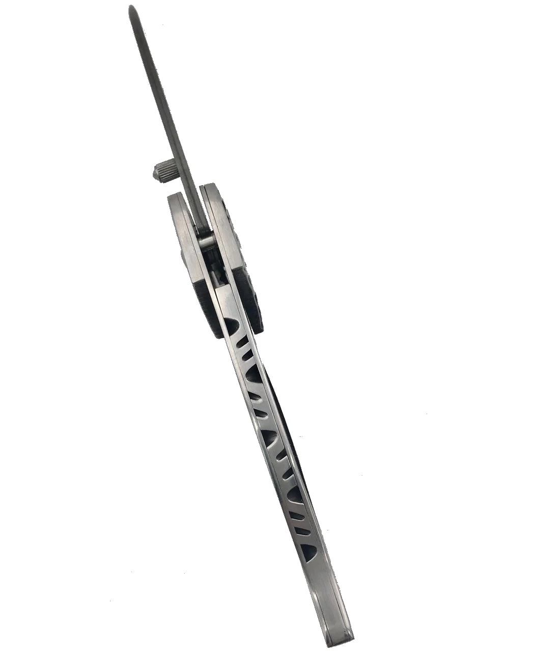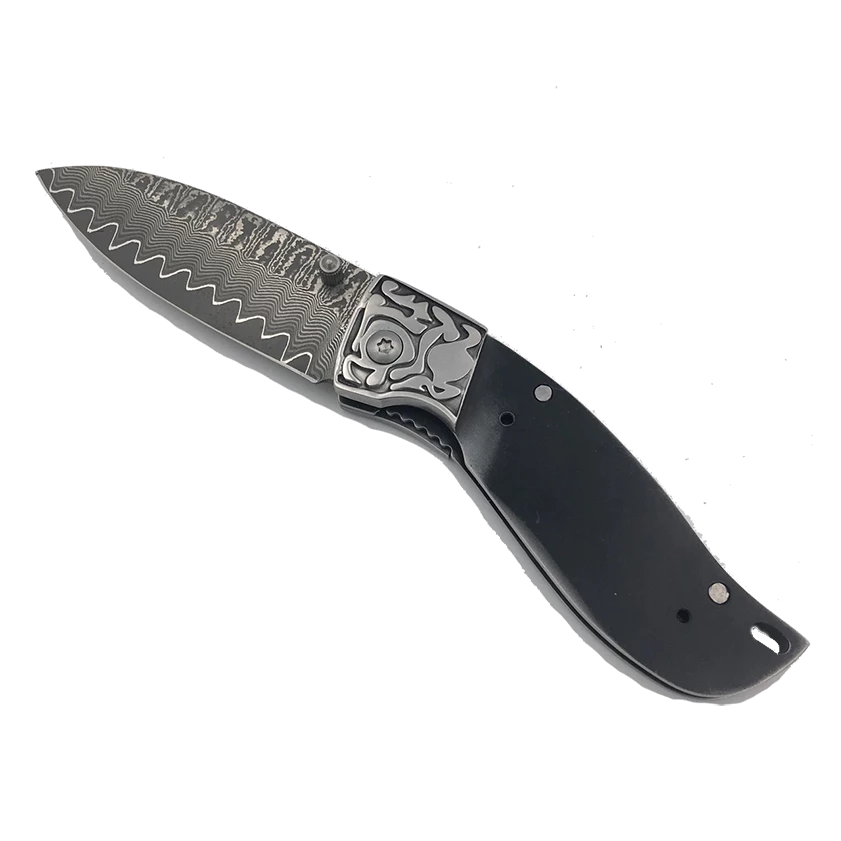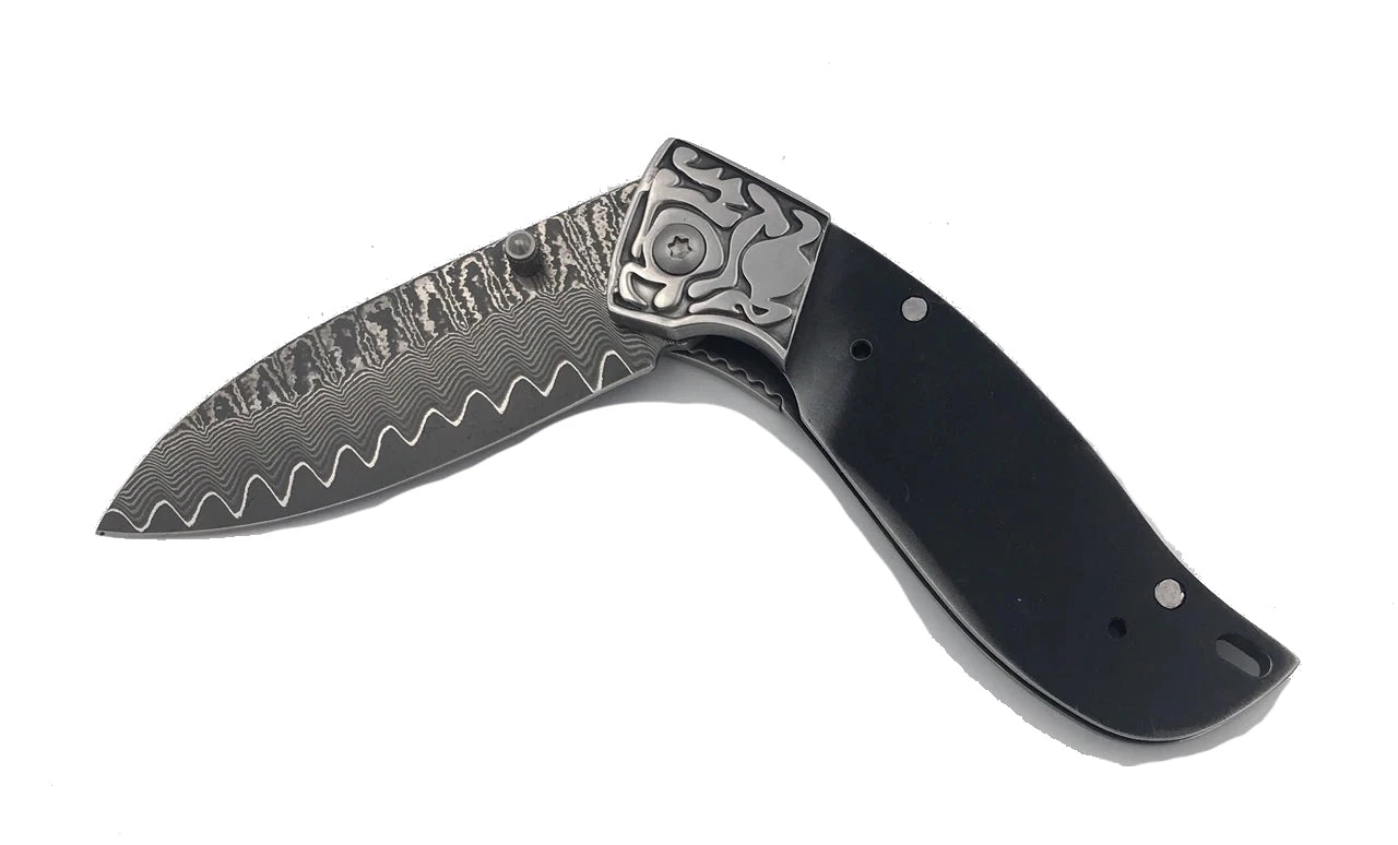 We attached stainless sculpted bolsters to accent the Damascus spine. Liner lock type mechanism. Attached thumb stud with file work on the spine and very sharp. Use rod or screws to fix handles.Â