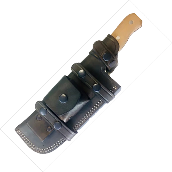This Heavy duty cross draw sheath made for the SK16 Cutlass BBQ chef knife can be used by either left handed or right handed users. Designed primarily as a “Presentation sheath” for table display it can be cross drawn (for righties) from behind the back or right side. For lefties belly mount or left side. Versatile and includes a wet stone for sharpening and a separate holder for a fire starter if desired. Made of heavy duty saddle back Italian leather this impressive sheath makes your overall presentation a hog wild experience. The perfect storage for a great knife.