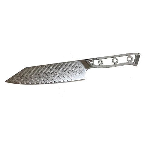 Made from folded VG10 this Damascus knife is elegant and unusual. The steel is folded to show a delicate feather on the blade. The knife is polished to a mirror finish not only bringing out the folds but accentuating the hammered area. It’s integrated bolsters provide a smooth, sturdy flow to the handle area. Blank comes in an attractive gift box.Â