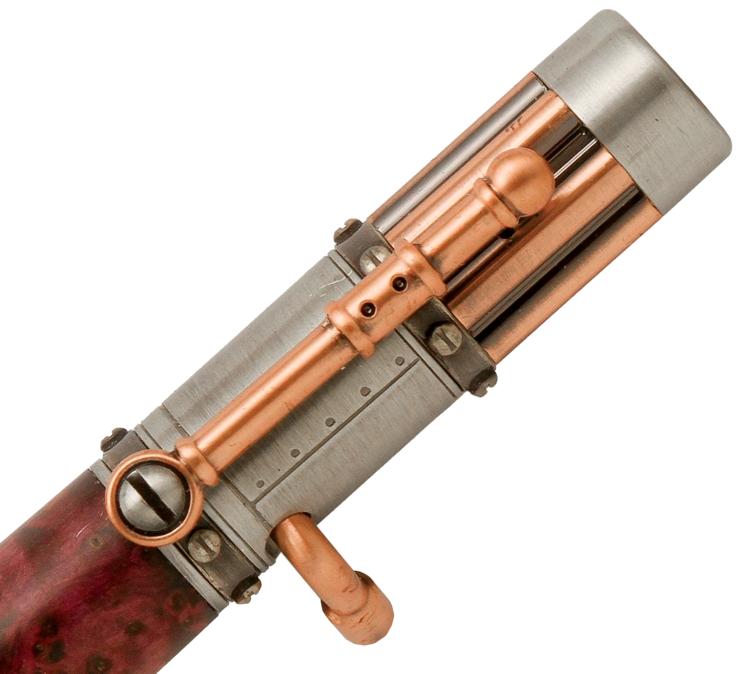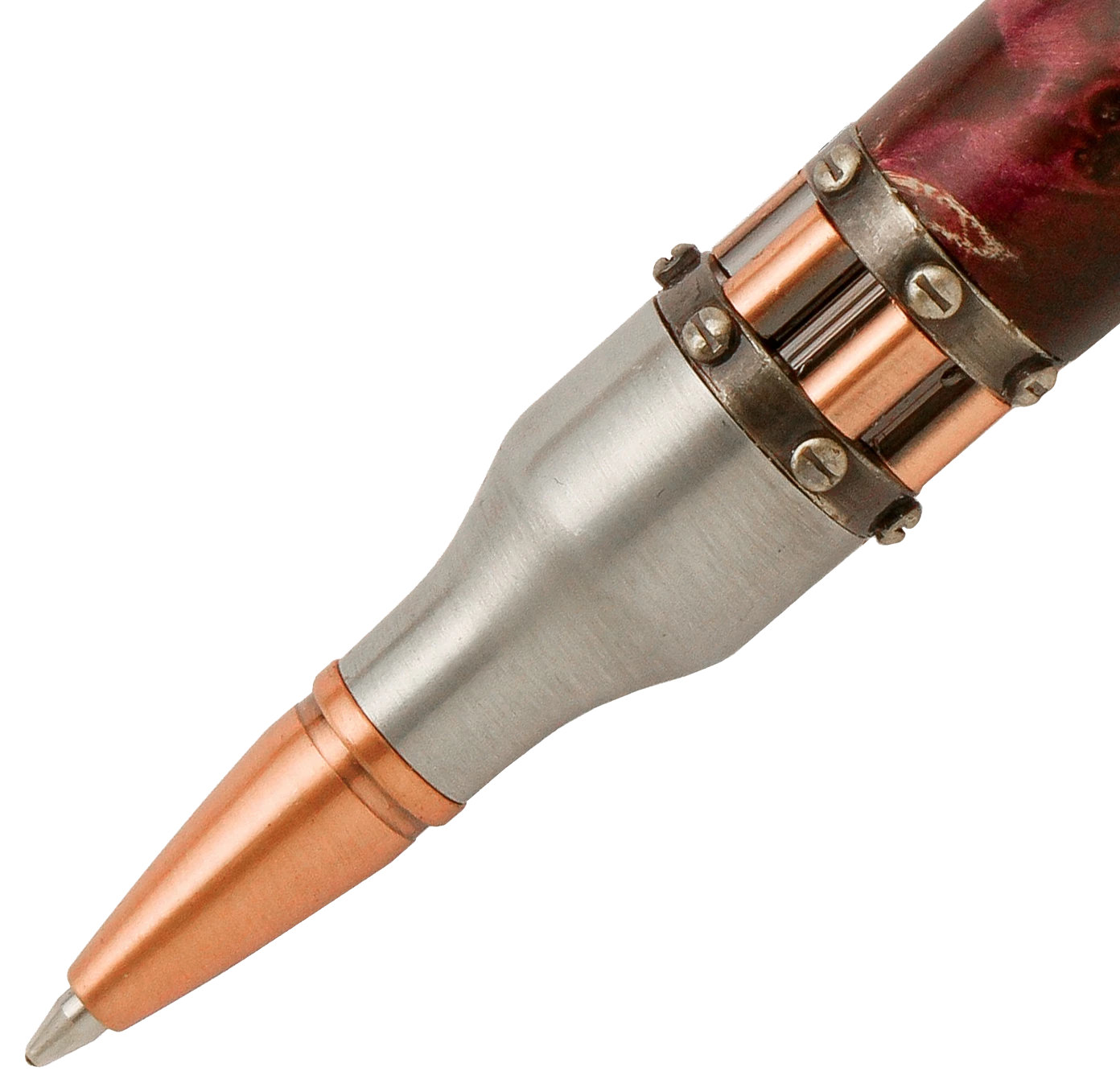 Here is a pen kit straight out of Victorian science fiction and the industrialized 19th century. The Steampunk genre has re-ignited a love of old fashioned materials and is all about mixing the old and new; fusing the usability of modern technology with the design aesthetic and philosophy of the Victorian age. We have designed our kit around this aesthetic; the kit combines flat head screws, riveted design patterns, replica Gattling gun barrels, a Bolt Action mechanism plus a mixture of industrialized Antique copper, pewter and brass finishes. Steampunk is a major trend in fashion, jewelry and design over the last few years – now is your chance to create the perfect pen as the ultimate Steampunk gift. Smooth writing performance with a Parker style refill.