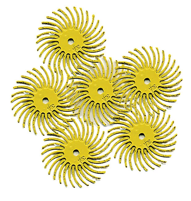 Individual discs are stacked to make a brush. Depending on the application, you will want to stack between three and six discs. Be sure to closely follow the directions in the package so that the discs are stacked and mounted properly onto a handpiece or the bench lathe.