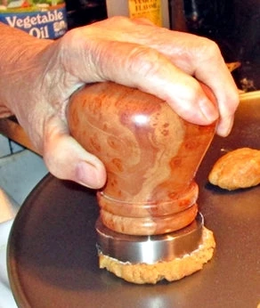 no need to “pound” as with traditional aluminum mallet style tenderizers. If you put a round knob style top as shown in the picture, it will be ergonomically comfortable to use for arthritic hands, making it easier to tenderize any piece of meat or press Grandma’s Peanut Butter Cookies!. Combine this meat tenderizer with the chicken press and make a mallet like in the photo for a super tenderizer! It also comes with a custom made rubber cap so it won’t mar counter tops to keep it on display when not being used.