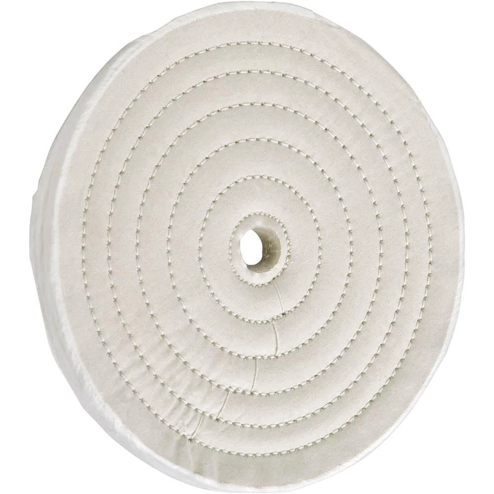Soft and loosely sewn, this muslin wheel is a must when making the final polish on soft and delicate metals as well as musical instruments. Perfect for bringing out a deep, lustrous shine. Soft feather-edged muslin is concentrically stiched together near the center, leaving the outer edge to provide a fine polishing surface. Perfect for stainless steel, chrome, gold or silver. 8″ diameter x 40 ply x 3/4″ hole.
