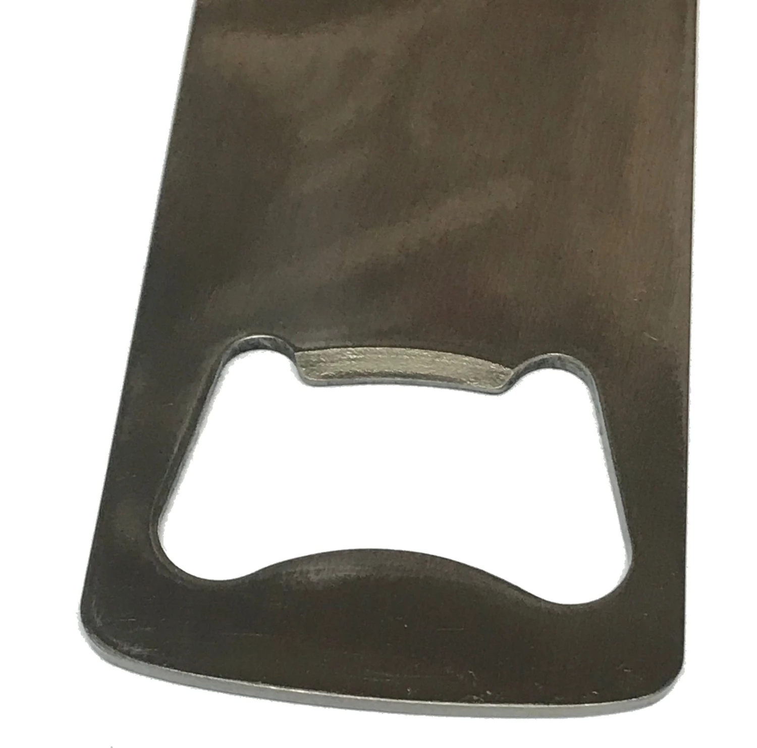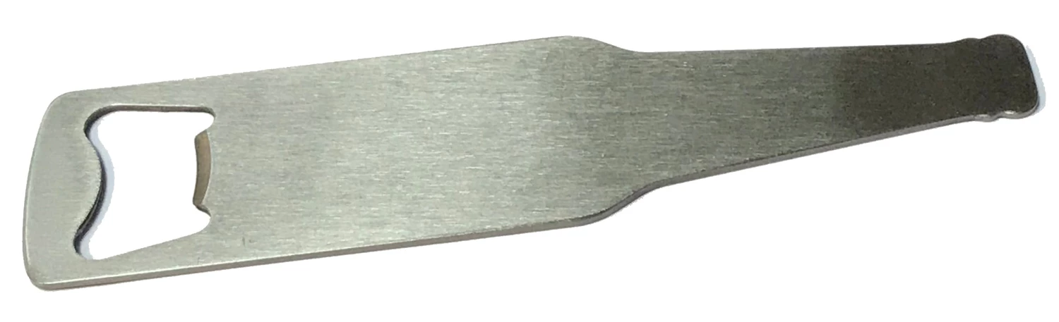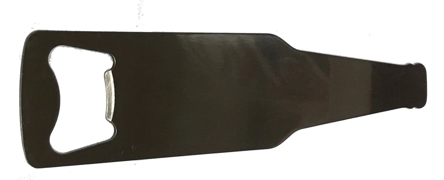 This slim Bottle Shaped Professional Bartender’s Bottle Opener Kit allows you to customize it with wood or acrylic knife scales. Standard sized knife scales will also work well for handles. You can either epoxy scales directly to the blank or you can easily drill pin holes and epoxy and pin the scales to the blank. Once completed, you’ll have a great bottle opener that slips neatly into your pocket when not in use. You can use the hole on the opposite end for hanging the bottle opener, or you can spin it on your finger like a pro. This item is perfect for custom laser engraving. Machined from stainless steel.