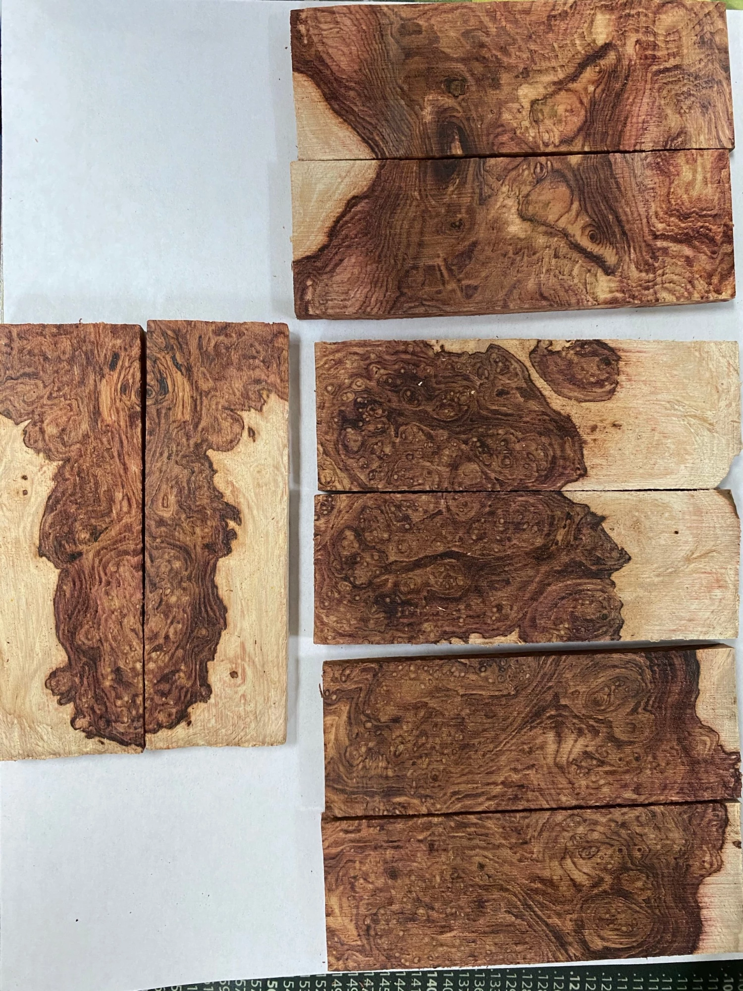 Honduran Rosewood burl knife scales-bookmatched measuring 5.5” x 2” x 5/16