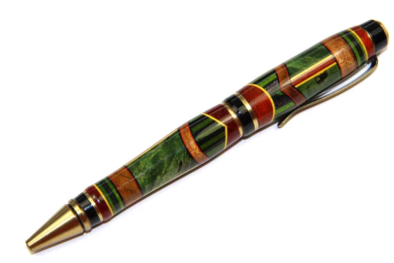 Welcome back to Mark’s shop. In this video, Mark will teach you the technique for a pen that does not use a pen kit: the pool cue pen. Building on the techniques learned in the first Gisi Segmenting Technique DVD, you will learn to build a new kind of segmented blank that not only applies to this pen, but can also be applied to any turned items. In addition to the wood and Gisi Accent Strips used in the last DVD, you will add acrylic to this project. In fact, by way of introduction to acrylic turning, Mark gives an entire lesson on acrylic bottle stop turning in the DVD extras.