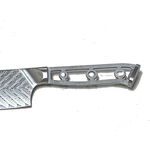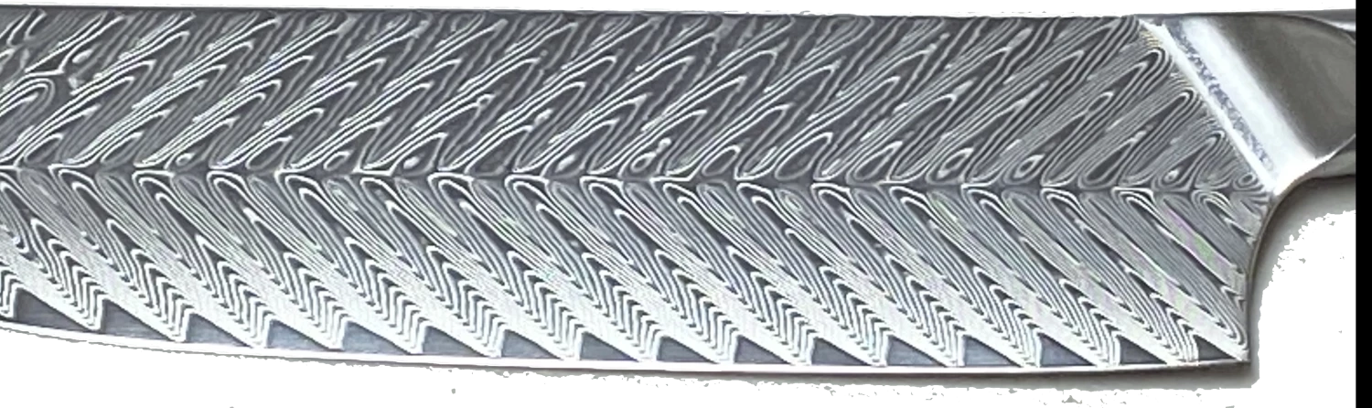 Made from folded VG10 this Damascus knife is elegant and unusual. The steel is folded to show a delicate feather on the blade. The knife is polished to a mirror finish not only bringing out the folds but accentuating the hammered area. It’s integrated bolsters provide a smooth, sturdy flow to the handle area. Blank comes in an attractive gift box.Â